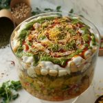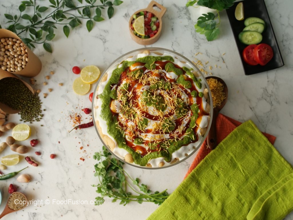 -In a deep serving bowl,add boiled chickpeas,chaat masala,red chilli crushed,prepared hari chutney, mixed vegetable salad,boiled potatoes,prepared meethi chutney,peanuts,sev nimco,prepared yogurt meethi chutney,hari chutney,papri,boiled whole green gram,chaat masala,dahi phulkiyan, yogurt,meethi chutney,hari chutney,red chilli crushed,sev nimco & serve!