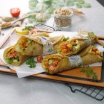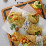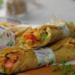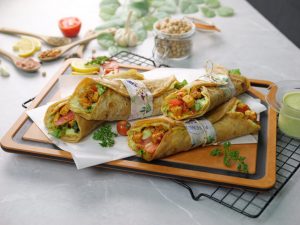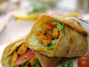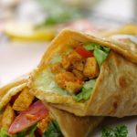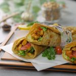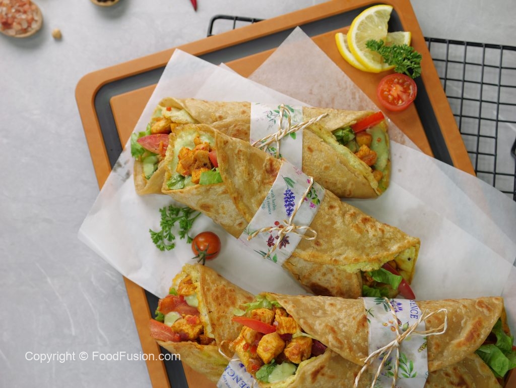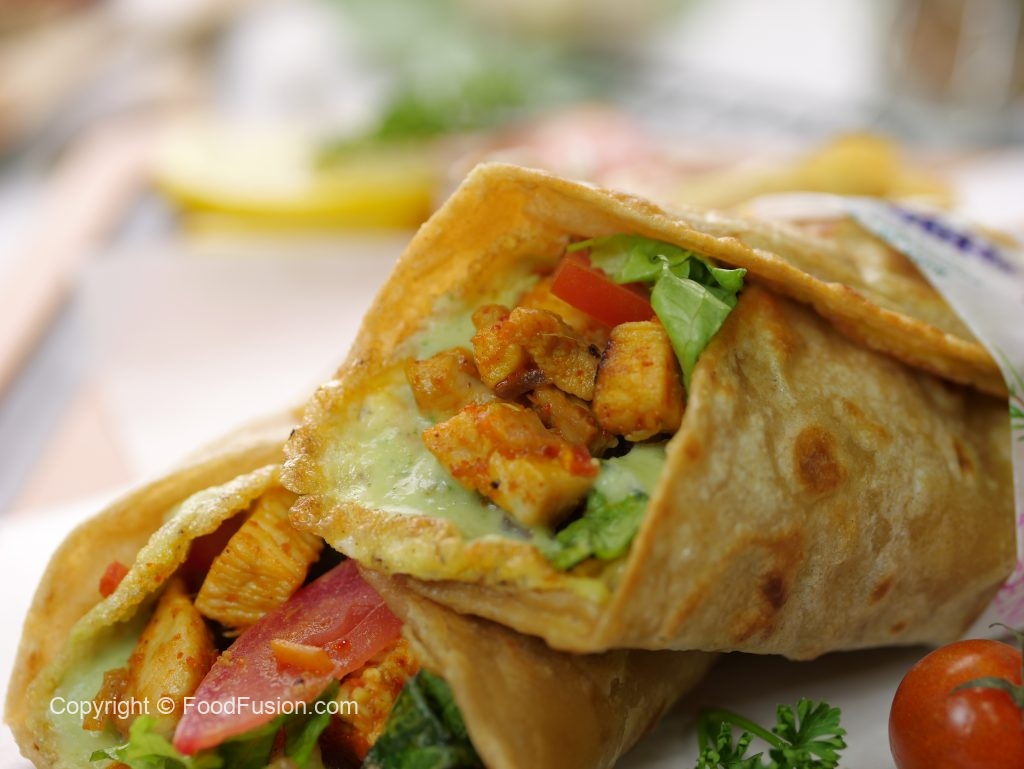 -Add & spread prepared chana dahi sauce,add chicken filling,tomato,salad leaves & fold both sides.