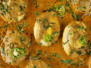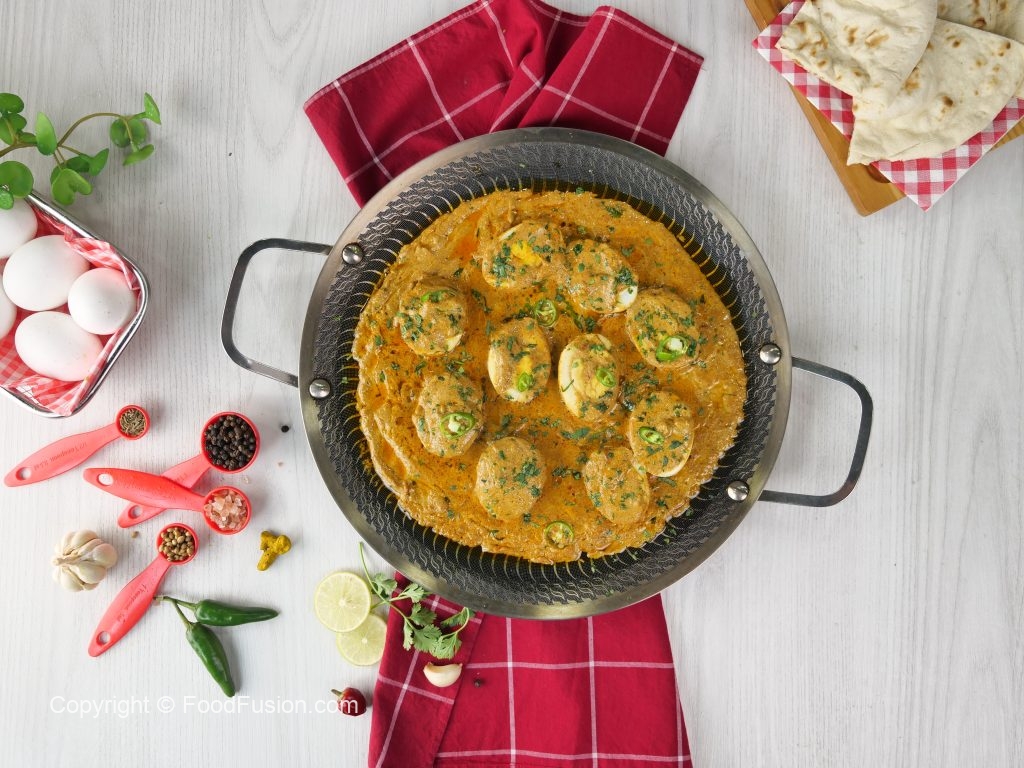 -Place halved eggs,pour gravy,sprinkle fresh coriander,green chilli,cover & cook on low flame for 1-2 minutes & serve!