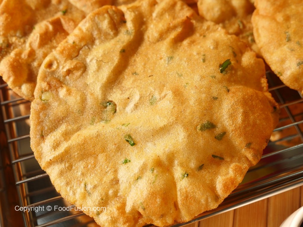 In wok,heat cooking oil and fry puri on medium low flame until golden brown.