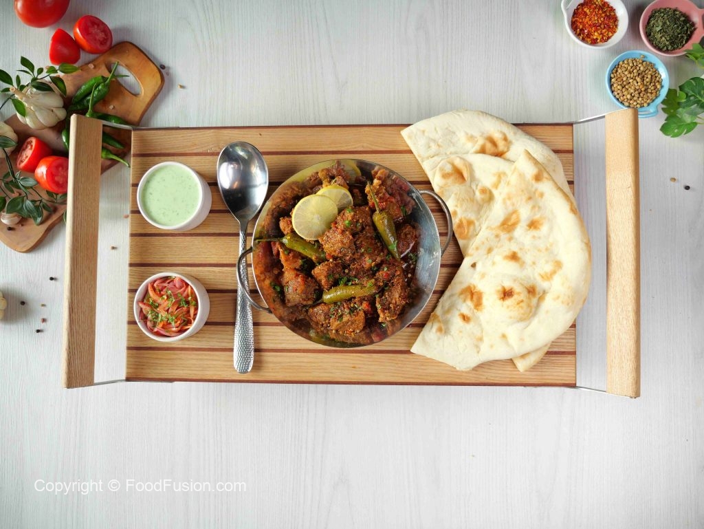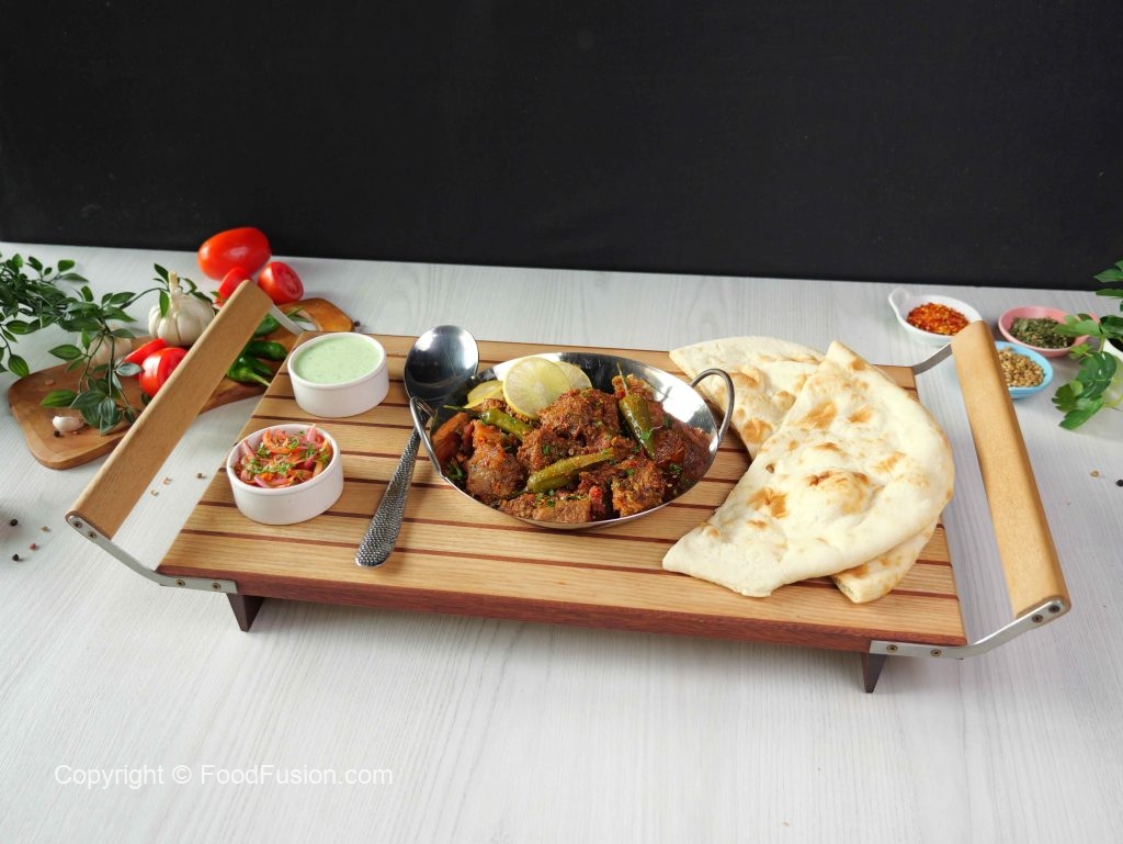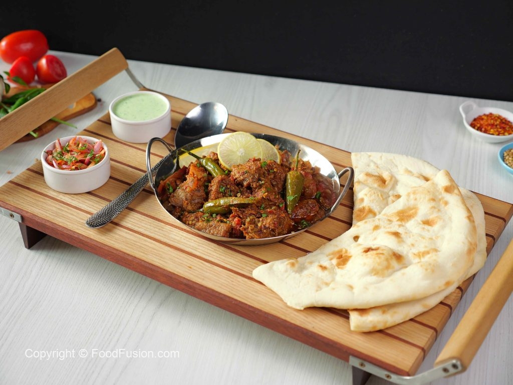 -In a serving dish, add balochi beef karahi, serve with naan, salad & raita!