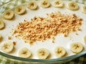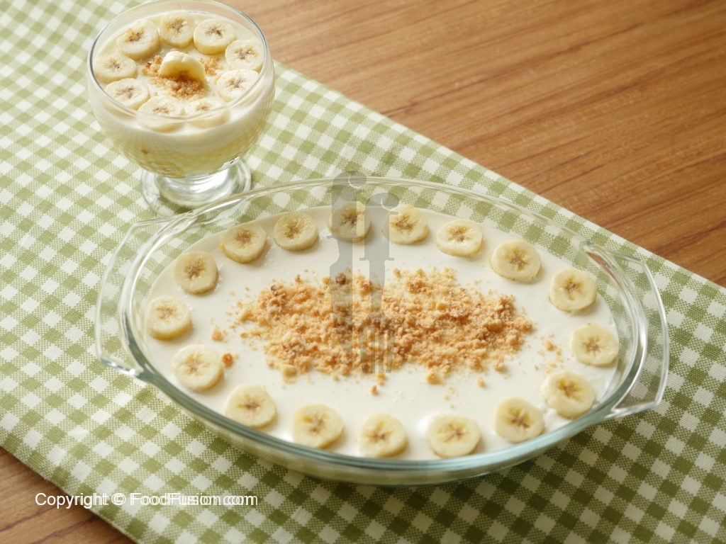 In serving dish,arrange sliced bananas and biscuits evenly.