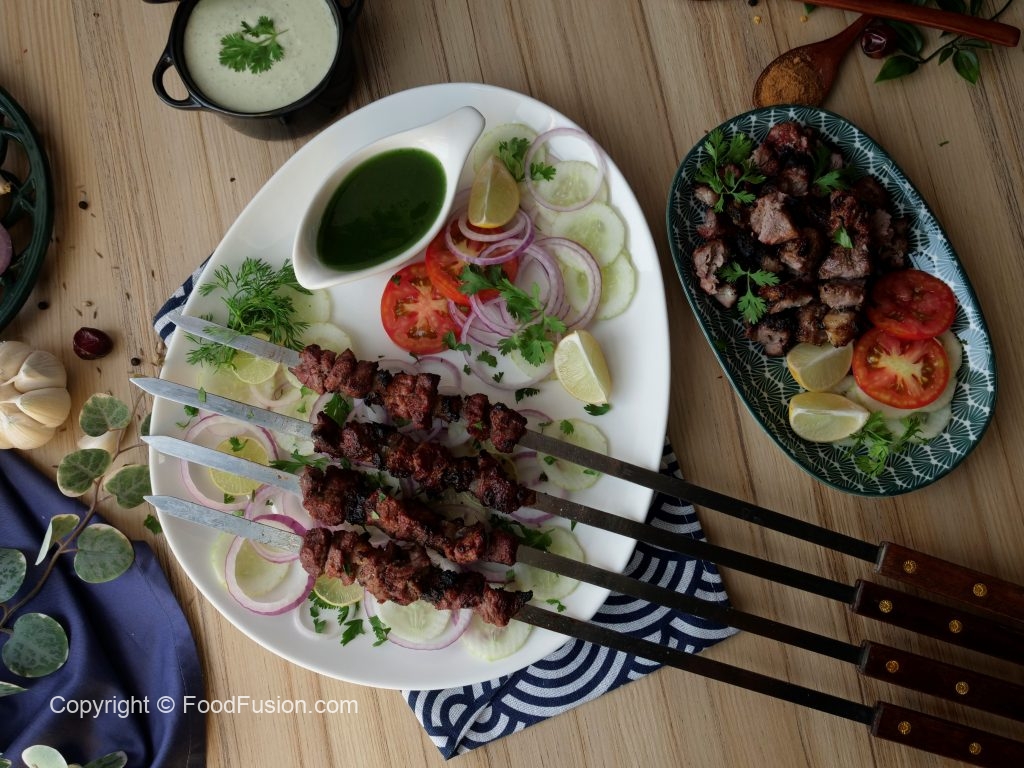 Serve Beef afghani boti with salad, raita & green chilli sauce.