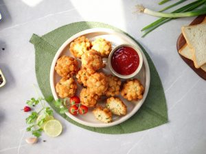 -Now coat chicken ball with bread cubes & press gently to set the shape.