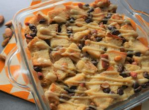 Add bread cubes,almonds,raisins,chocolate chips,prepared egg mixture,bread cubes,raisins,almonds, chocolate chip and prepared egg mixture.