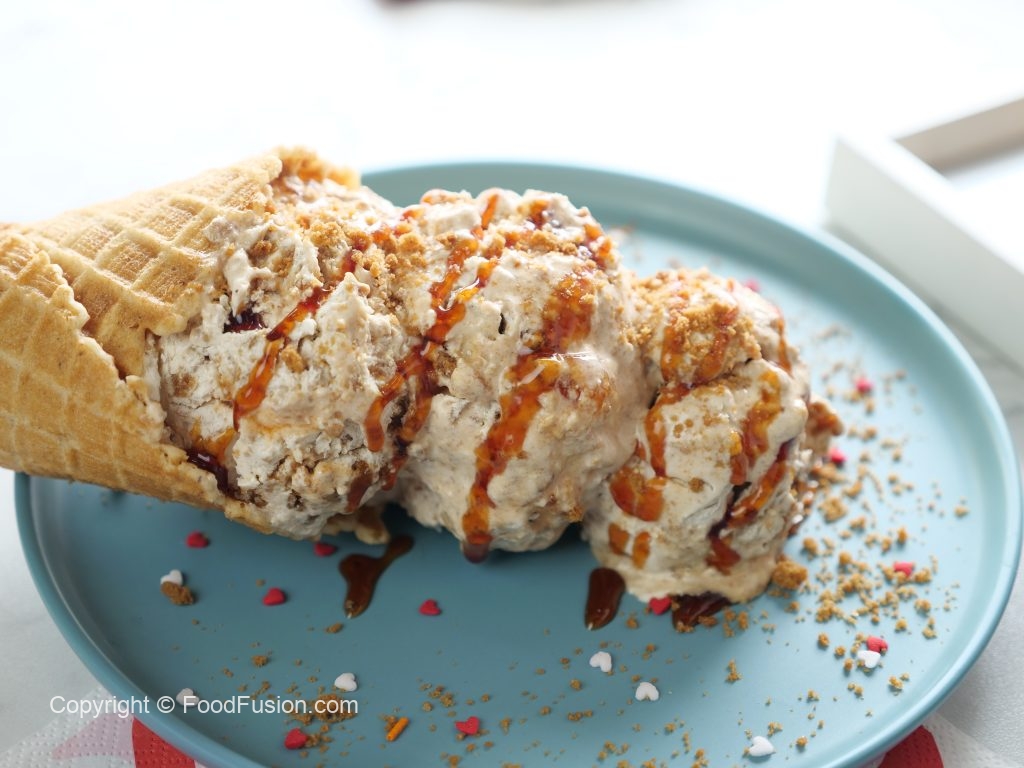 -Once frozen completely,scoop out,drizzle caramel syrup,add crumbled candi biscuits & serve!