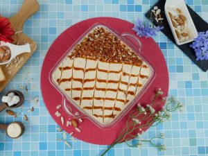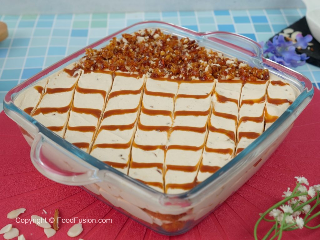 In a serving dish,add a layer of plain sponge cake,drizzle caramel sauce,caramel cream,plain sponge cake,caramel sauce,caramel cream and spread evenly.