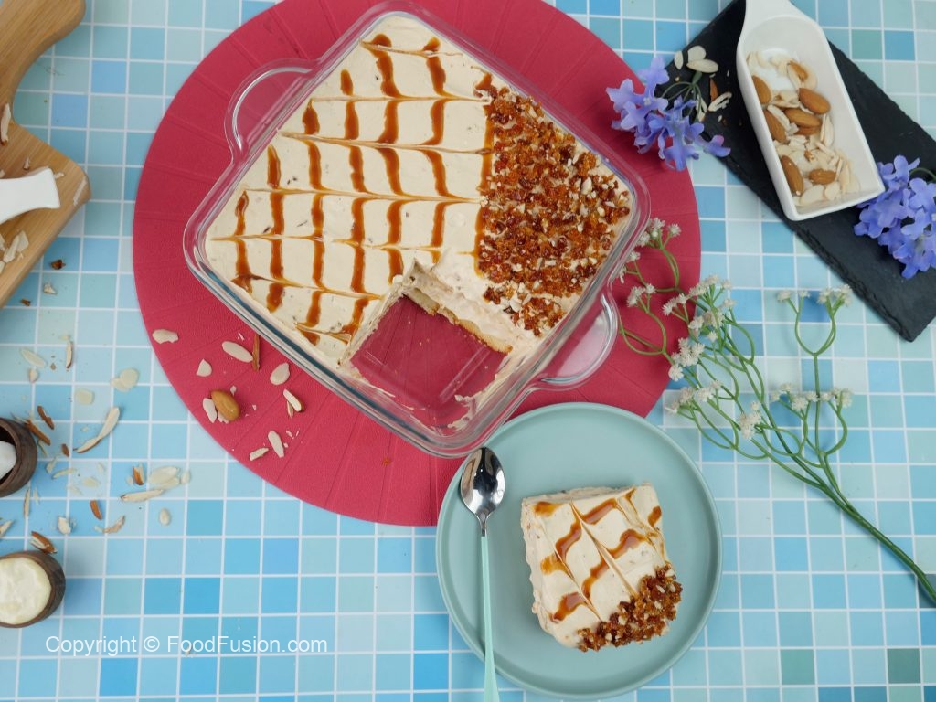 Garnish with caramel sauce,caramel crunch & serve chilled.