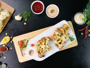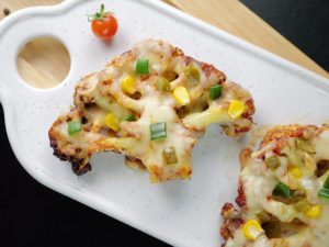 -On cauliflower disc,add & spread pizza sauce,add pizza cheese,capsicum,corn kernels,pickled jalapenos & air fry at 180C until cheese melts (3-4 minutes).