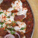-In a serving platter, add Chapta Cut Kabab Masala, add whisked yogurt, garnish with kashmiri red chilli powder, onion rings, reserved kabab pieces, lemon slices & fresh coriander, and serve with naan!