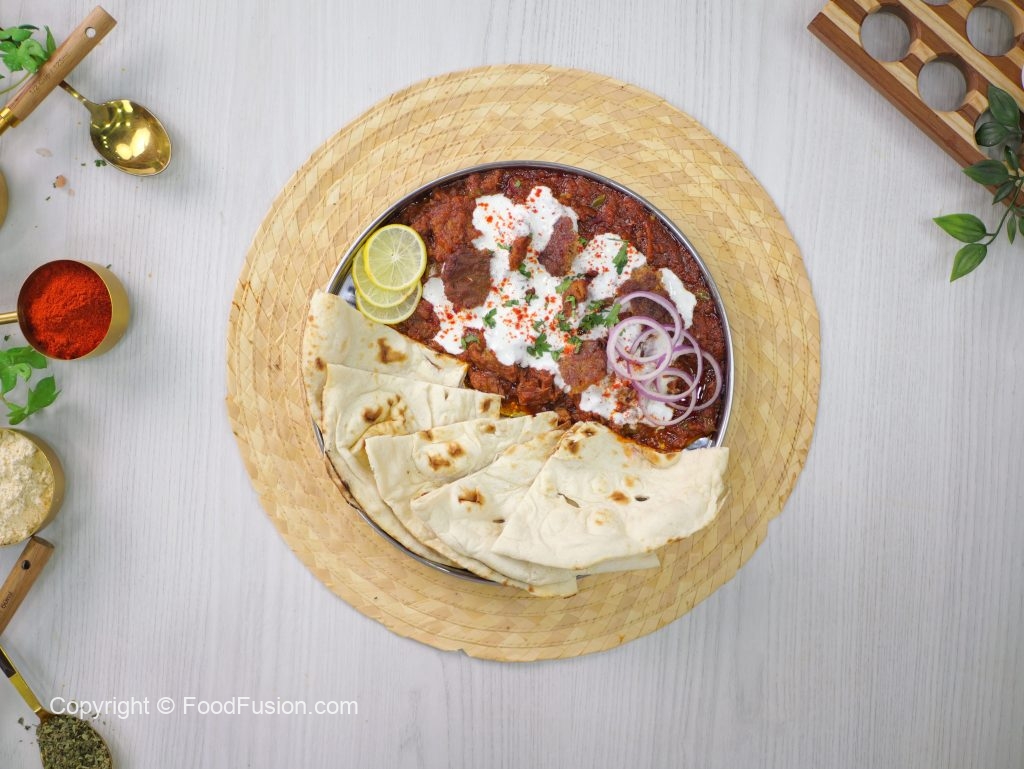 -Serving platter mein Chapta Cut Kabab Masala dalein, upar se whisked yogurt dalen, garnish karein kashmiri red chilli powder, onion rings, reserved kabab pieces, lemon slices aur fresh coriander ke saath, aur naan ke saath serve karein!