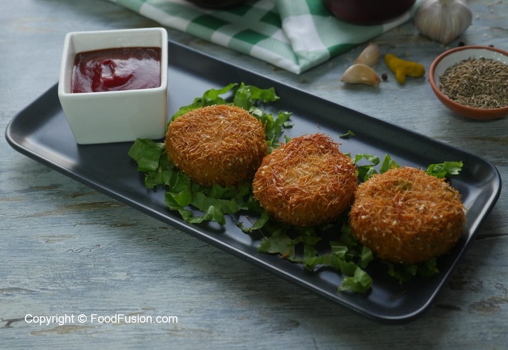 Now dip cutlets into beaten eggs and coat in crushed vermicelli.