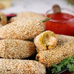 -Stuffed green chillies with prepared filling,coat in gram flour batter then coat with sesame seeds (makes 30-35) & let them rest for 15 minutes.