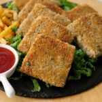 Four piece mein cut ker lein aur bread slice ki potato side ko breadcrumbs sa coat ker lein (makes 8 bread slices).