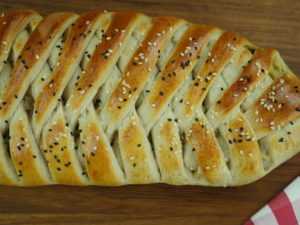 Dough ko baking tary per rakh ker egg sa wash ker lein,kalonji aur safed til sprinkle ker lein aur preheated oven mein 20-25 minute kliya bake ker lein.