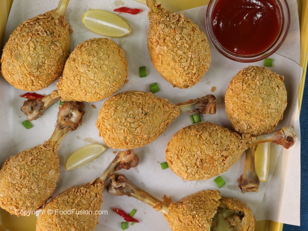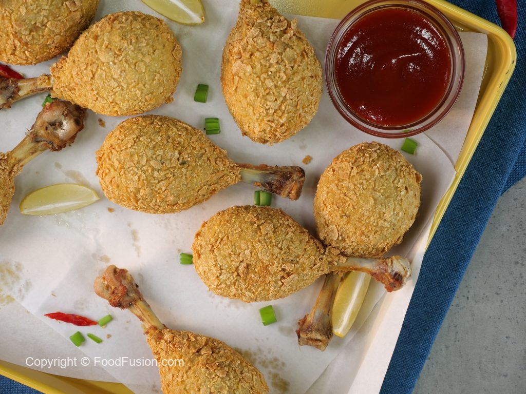 -Ab chicken drumsticks ko maida mein coat karein aur pheetay hoye anday mein dip ker lein phir cornflakes mein coat ker lein.