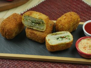Take a dough,add chicken filling and mozzarella cheese,apply water at the edges,fold it and press and seal the edges with cookie cutter.