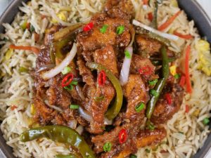 -Add boiled rice,black pepper powder,pink salt,white pepper powder,chicken powder,soy sauce,chilli sauce,vinegar,mix well & cook for a minute.