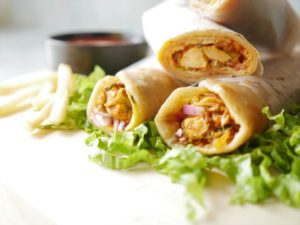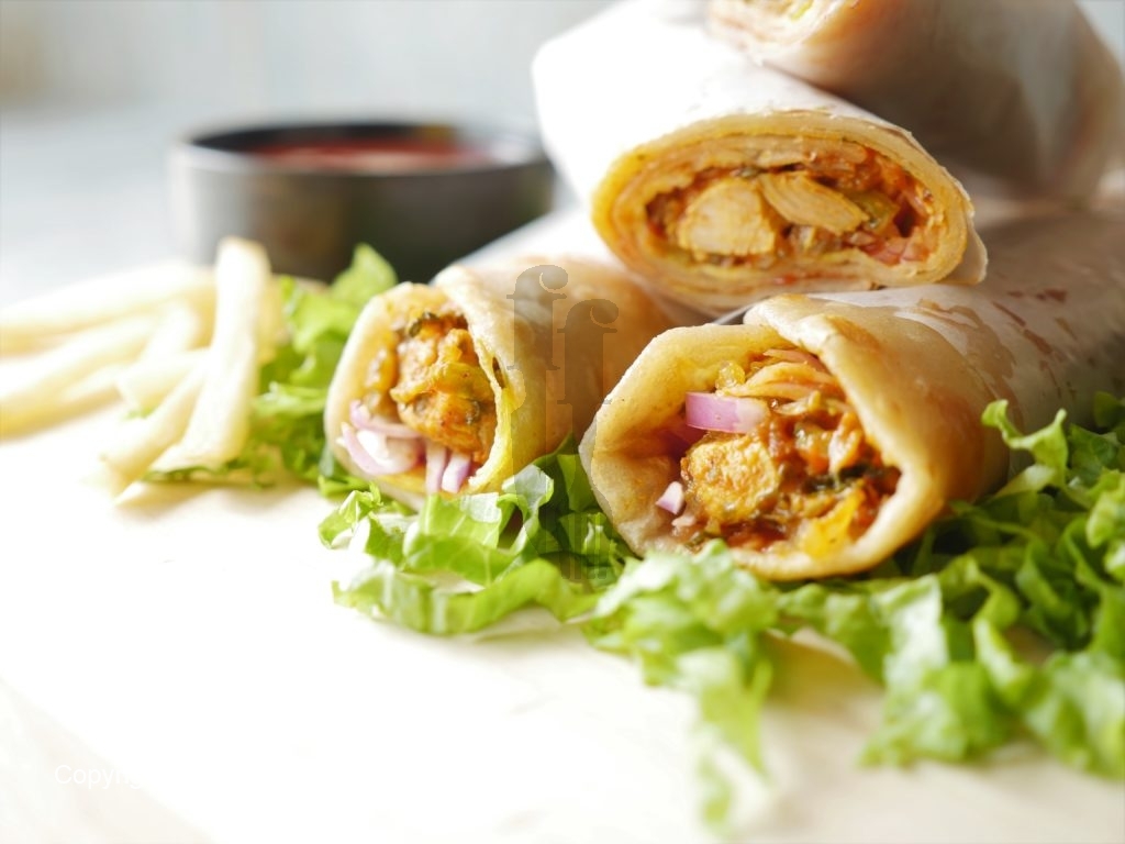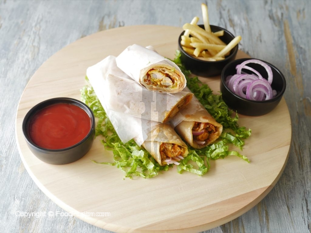 Paratha per tomato ketchup,pyaz soaked in lemon juice aur cooked chicken dal ker wrap ker lein & serve karein.