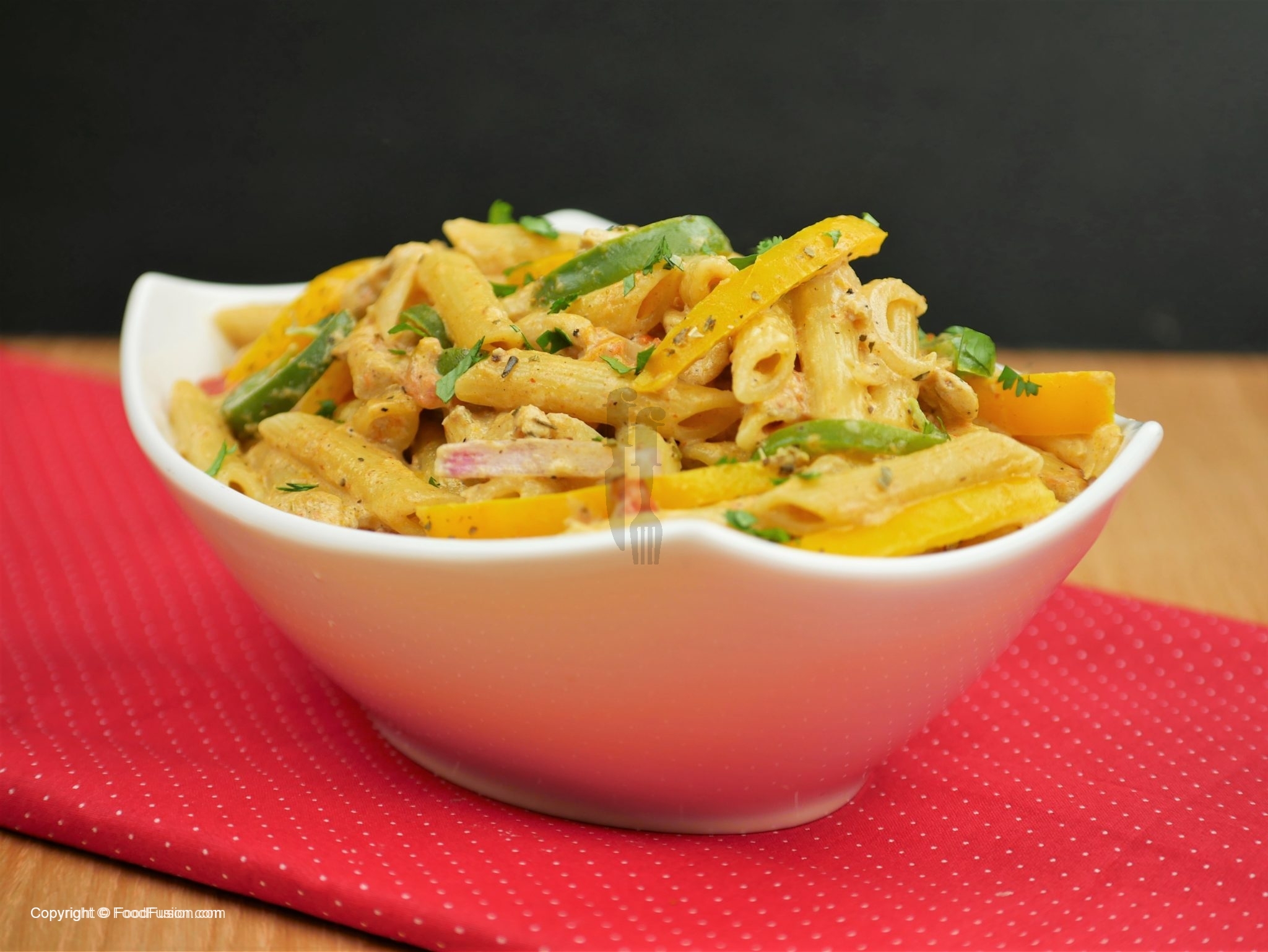 -Karhai mein oil,tamatar,fajita seasoning dal ker tamatar naram hunay tak paka lein,cooked chicken, penne pasta cooked aur vegetables dal ker ache tarhan mix ker ein.
