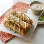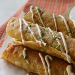 Corn tortilla per cheese mixture aur chicken fries dal ker roll ker lein aur toothpick laga lein.