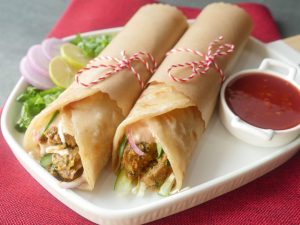 On paratha,drizzle tomato ketchup,stir fried vegetables,fried chicken nuggets and drizzle prepared cream & cheese sauce,warp in butter paper & serve!