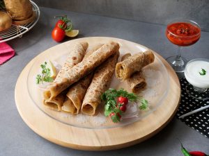 Paratha per tomato ketchup,stir fried vegetables,fried chicken nuggets aur tayyar cream & cheese sauce dal dein aur butter paper mein wrap ker ka serve karein!