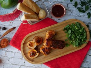 Add 2 tbs of prepared pizza filling & roll the fillet then insert mini skewers to seal sides properly.