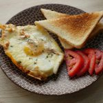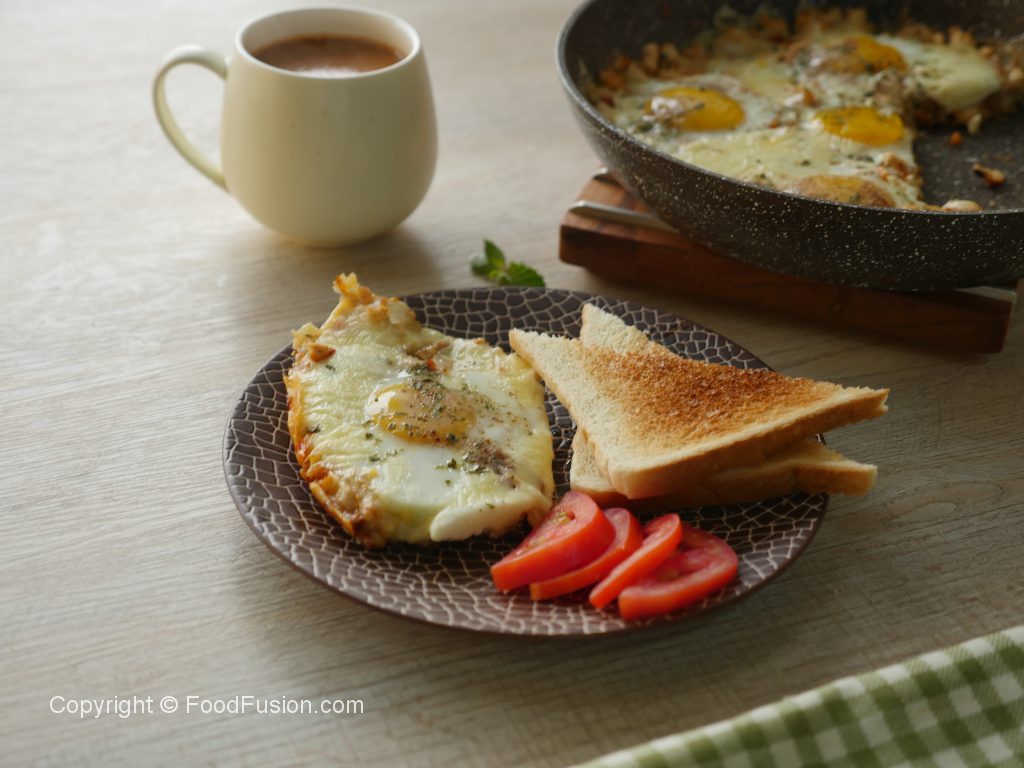 Pakay hoye mixture ko evenly pheela lein aur holes bana lein phir ek,ek ker ka anday shamil karein aur namak,kali mirch powder aur dried parsley chirak dein aur halki ancch per 2 minutes kliya paka lein.