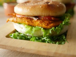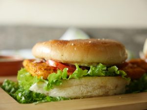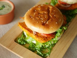 On burger bun,add chutney,salad leaf,grilled chicken fillets,onion,tomato ketchup and tomato slices.
