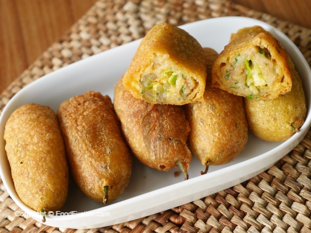 In green chilies,add masala mix or mozzarella cheese with masala mix,coat with potato coating then dip into pakora batter.