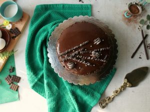 -Place first layer of cake on cake stand,apply prepared chocolate frosting and add chocolate chips.