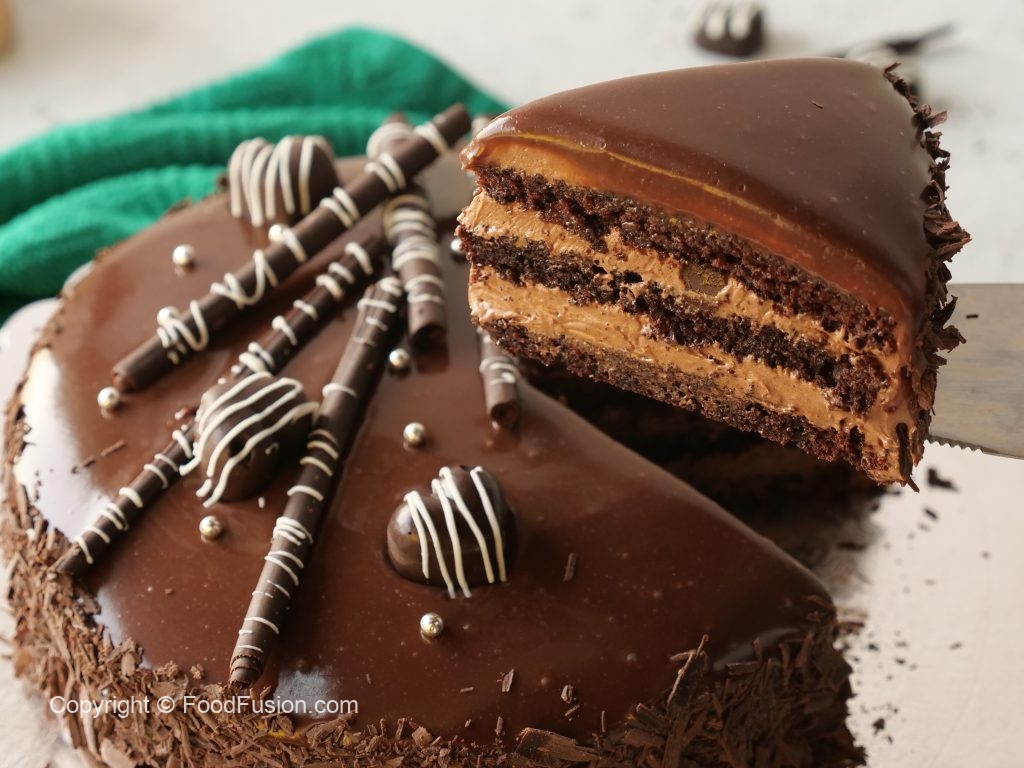 -Ek aur cake layer rakh dein,tayyar chocolate frosting laga ker chocolate chips dal dein,same yehe process cake ki third layer ka saath karein aur frosting laga ker cake ki sides ko cover ker lein & 1 hour kliya refrigerate ker lein.
