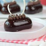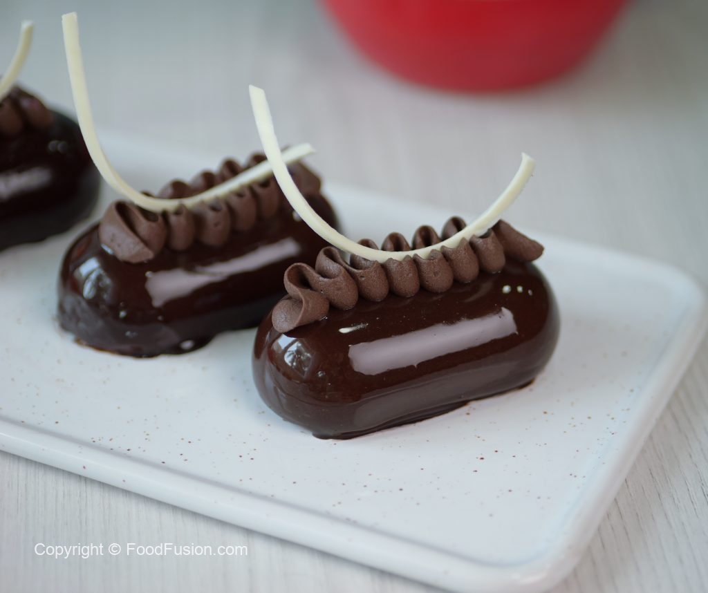 -Pipe out the chocolate mocha mousse in oval shape silicone cake mold,spread evenly & place a thin layer of sponge cake,press gently & freeze for 6 hours or overnight in freezer.