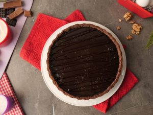 Pour prepared chocolate ganache over walnut salted caramel sauce,spread evenly & let it set in refrigerate for 2 hours.