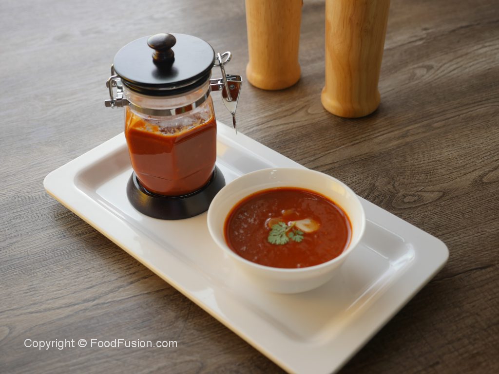 In blender,add button red chilies,Kashmiri red chilies,fresh coriander,garlic,cumin seeds,salt and water, grind until well combined.