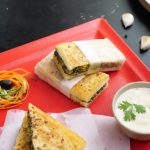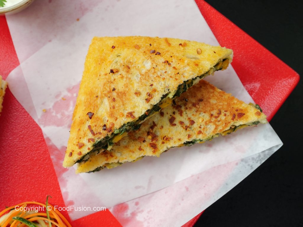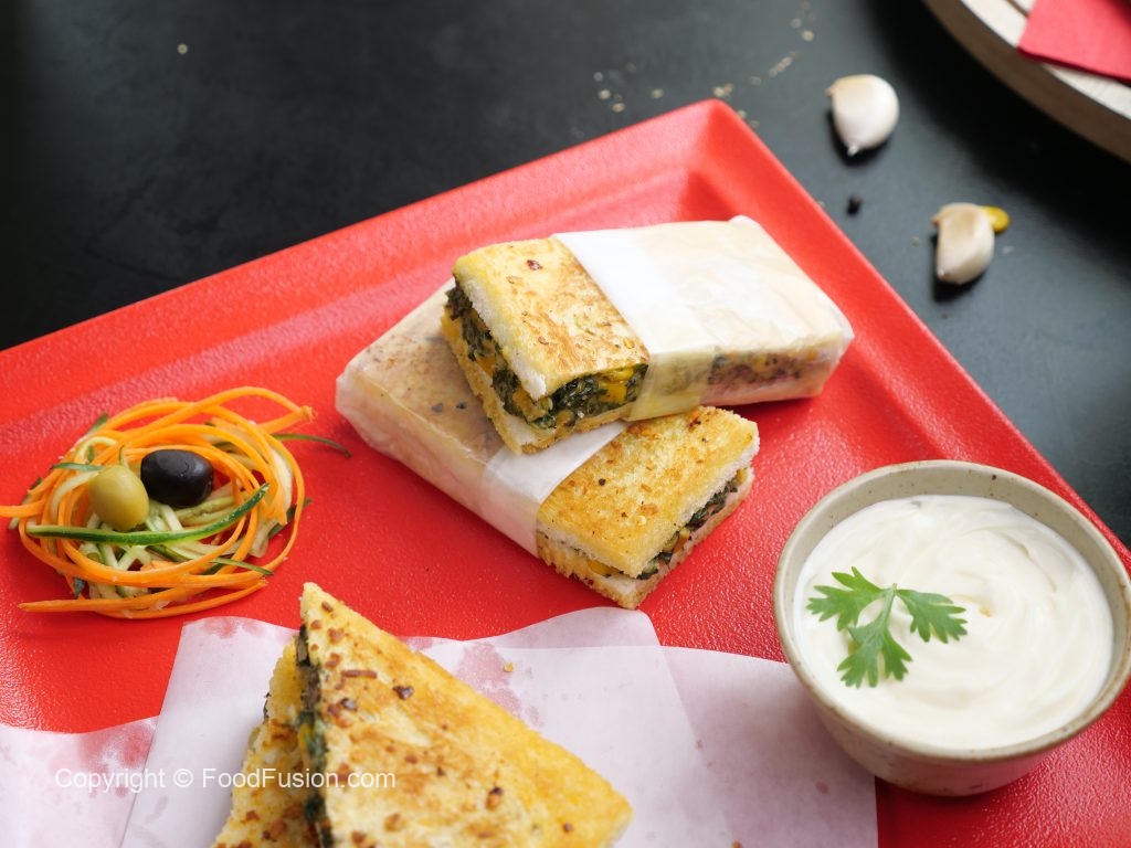-Add butter,garlic,red chilli crushed,flip the sandwich & cook other side until golden & crispy (makes 4).