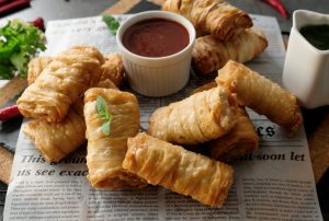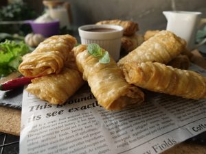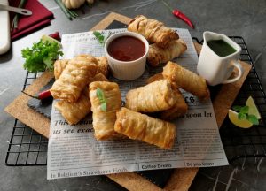 Add prepared creamy chicken filling and apply flour slurry then fold the sides and roll sheet to make samosa (makes 18-20).