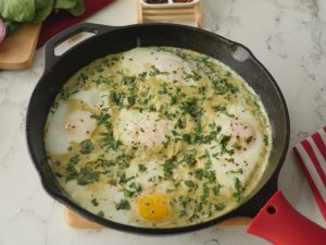 Ek,ek ker ka anday shamil karein,kali mirch crushed,cheddar cheese aur hara dhania dal ker dhak dein aur halki ancch per 2-3 minutes kliya paka lein & serve karein!