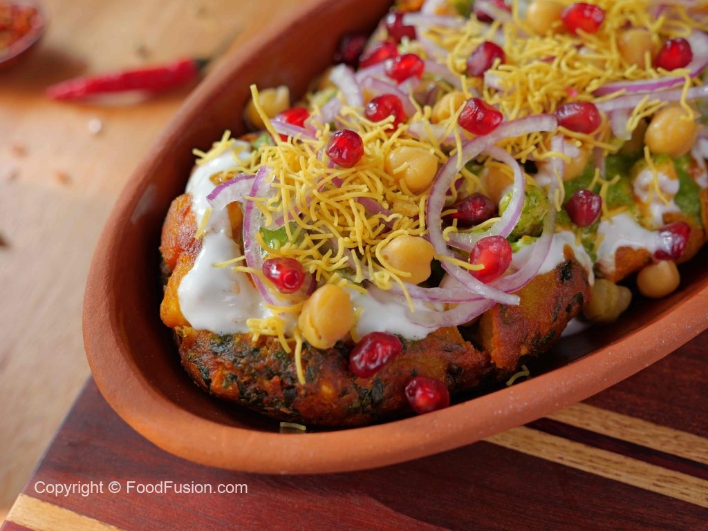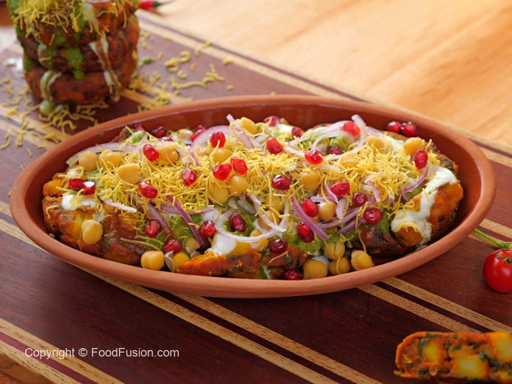 -In a serving plate add fried Aloo tikki, smashed it, add boiled white chickpea, yogurt, gur imli chutney, prepared green chutney, onions, boiled white chickpea, daal sev, pomegranate corns & serve!