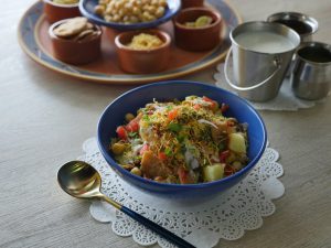 In serving plate,add papri,dumplings,chickpeas,potato,tomato,onion,salt,red chili crushed,chaat masala,cumin seeds,lemon juice,green chutney,date tamarind chutney,yogurt,chickpeas,papri,potato, tomato,onion,sev nimco,yogurt,green chutney,date tamarind chutney,green chutney,red chili crushed, salt,chaat masala,fresh coriander & serve!