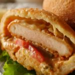 Place cheddar cheese slice,jalapenos,chicken patty,pickled cucumber,tomato slice,prepared sauce, mozzarella cheese slice,gather and seal all edges.