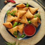 -Take samosa sheet & make pocket,add chicken stuffing in the center,stuffed green chilli,roll into the shape of samosa & seal corners with flour slurry (makes 16-18).