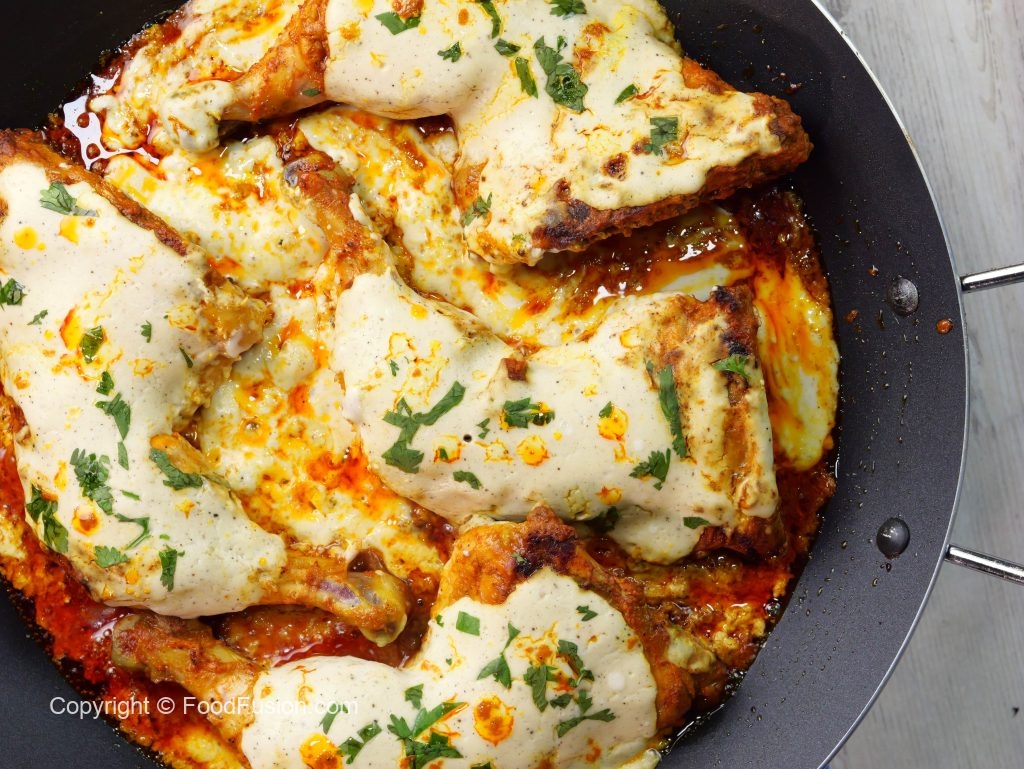 -Remove cover, flip the chicken pieces, pour prepared signature garlic sauce over chicken, cover & cook on low flame for 2-3 minutes.