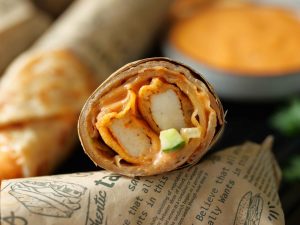 -Paratha per dynamite sauce dal ker pheela lein,iceberg,tamatar,kheera aur dynamite chicken dal kar fold karein aur butter paper mein wrap ker lein (makes 6-8 Paratha rolls).