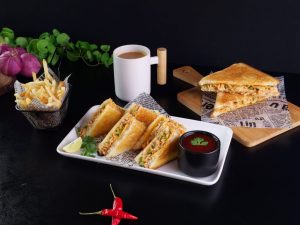 -Heat cast iron frying pan,place sandwich (upside down),apply melted butter on another side & grill from both sides until golden & crispy (makes 6).