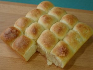 Grease 8 x 8” square baking pan with melted butter and place small balls of dough.