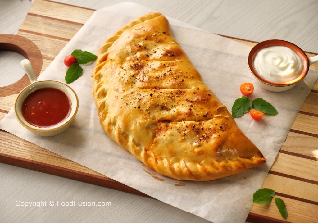 -On baking tray,place prepared calzone & with the help of the knife slightly add marks on the surface,apply egg wash & sprinkle red chilli crushed (makes 2).