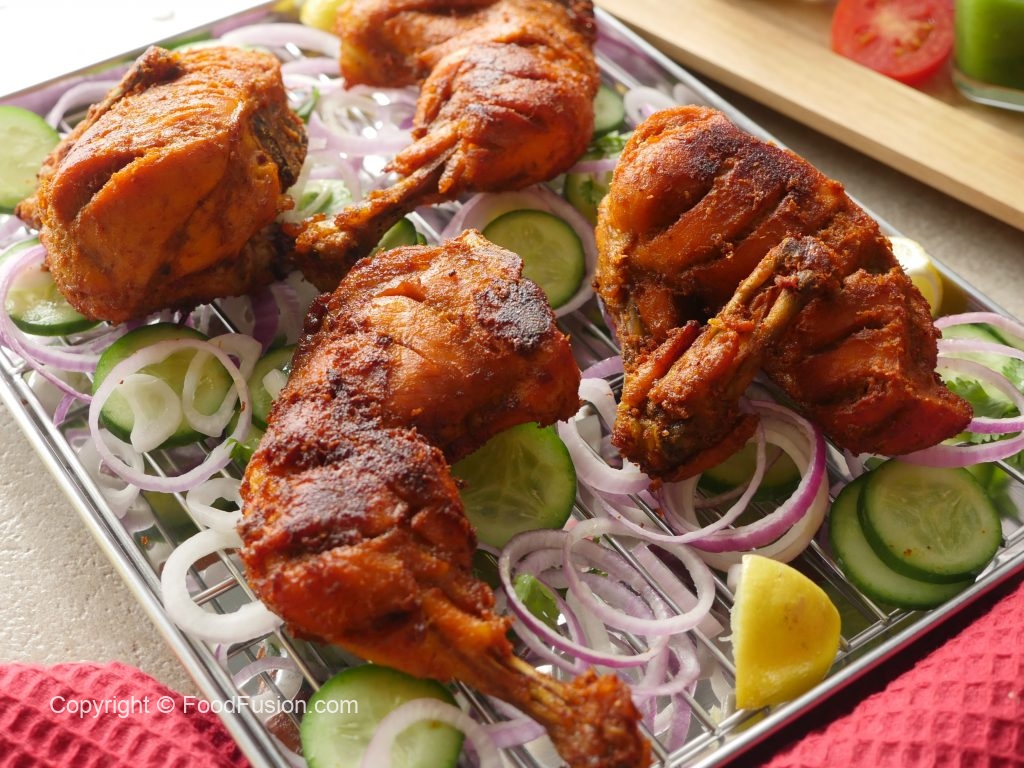 In a wok,add cooking oil,marinated chicken pieces,cover & steam cook on low flame (8-10 minutes each side) then cook on medium flame until water dries up (6-8 minutes).