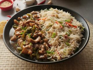 -Fried rice ko Chicken Mongolian ka saath serve karein.